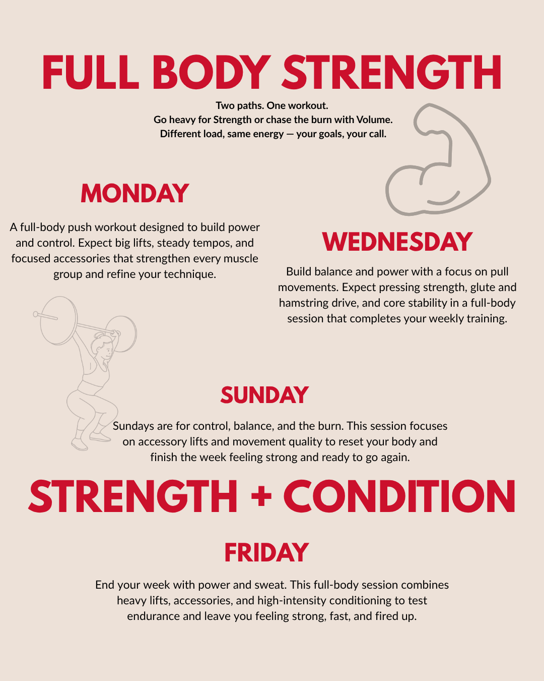A fitness plan poster with daily workout themes for full body strength training, featuring illustrations of a person lifting weights and a muscular arm, with bold red headers for each day.