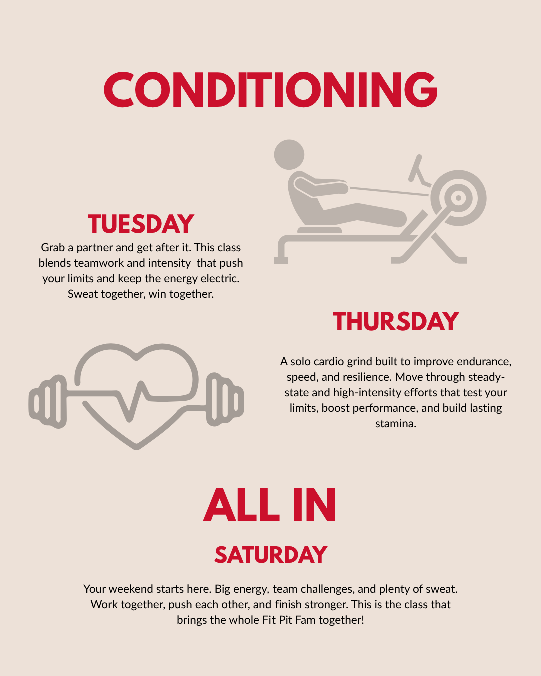Fitness class schedule outlining workouts for Tuesday, Thursday, and Saturday, with icons of exercise equipment and motivational text.
